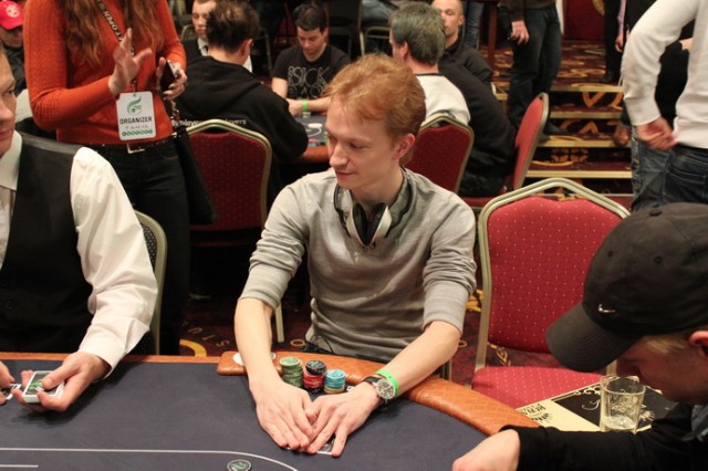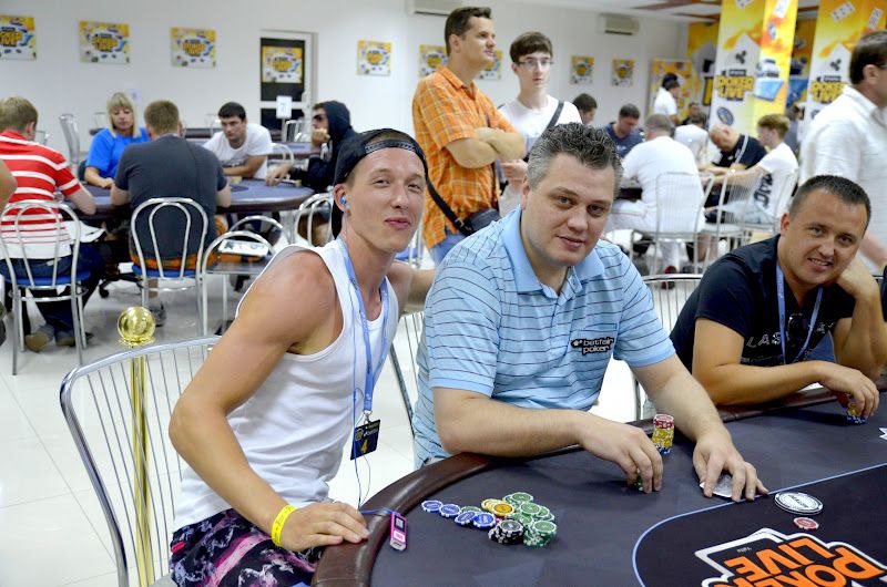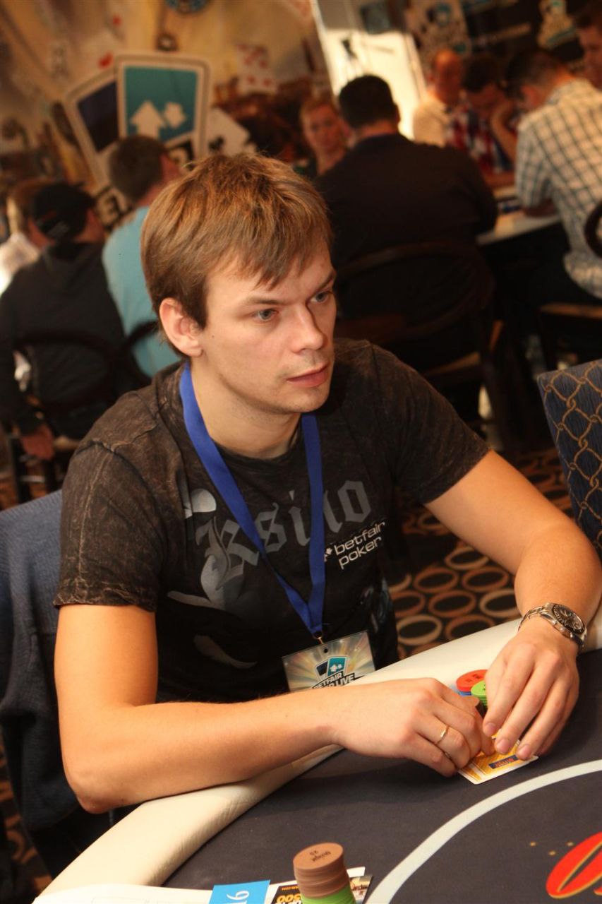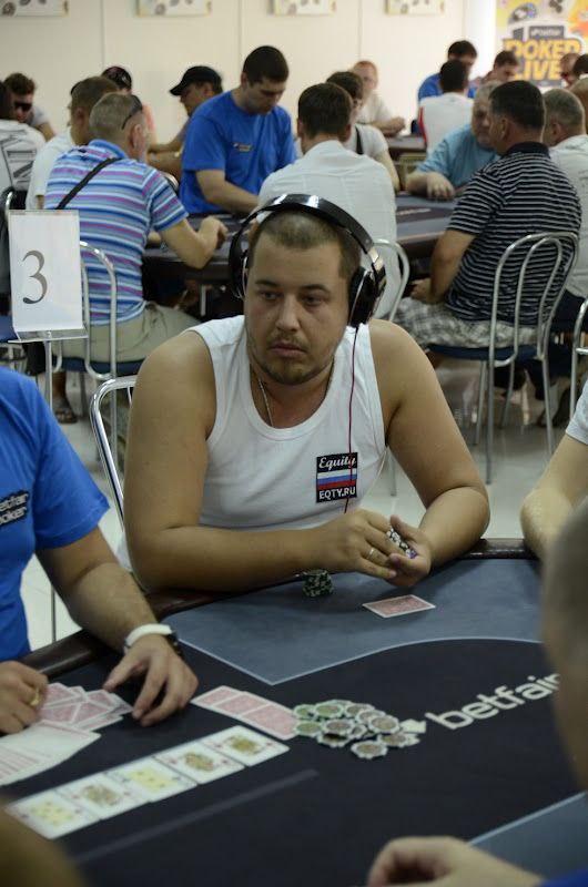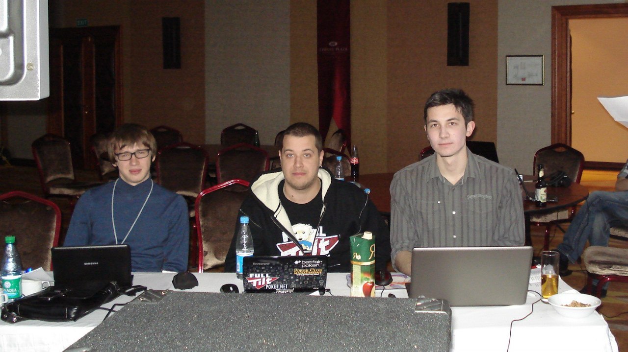 Мой стол, слева на право. Слева от меня сидел очень агрессивный игрок вроде как фин (фин1). Постоянно заходил на эни ту рейзил, ререйзил, в общем играл очень опасно, но вроде как был адекватен. Стек его постоянно колебался от 3 до 12 тысяч. Сразу за ним сидел очень известный в Эстонии агро игрок – Юкка Хелпи, играл не хотя, и по нему было понятно, что на саму игру ему наплевать. Колил любые ставки до ривера и на ривере падал. Какой либо адекватной игры я от него так и не увидел. За ним сидел ещё один фин (фин2). Играл не очень широкий диапазон от 66+ АTs, агрессивно играя при каком либо попадании, иногда блефовал и сильно разыгрывал натсы. Его я для себя пометил как адекватного игрока средней силы. За ним сидел очень слабый, отлично читаемый игрок (фиш). Не знаю от куда он, может тоже фин, может эстонец. Вик тайт, отлично падающий на контбеты, тянущий различные дро и проплачивающий все подряд. Далее сидел пьяный фин, вылетевший 12-й рукой. Он сразу начал играь пуш-фолд, в итоге заколив алын того самого очень слабого парня на А6о против КК. Далее сидел человек, занявший 3-е место в этом турнире. Очень адекватный сильный тайтовый игрок говорящий по-русски (рус1). За ним сидел русский (рус2). Для себя я пометил его как игрока средней силы (скорее даже слабого), падкого на тильт. Он постоянно пытался вскрыть финна (того самого с не очень широким диапазоном). И сразу передо мной сидел абсолютно пьяный американец. Ему адски перло с картой, но об этом потом.