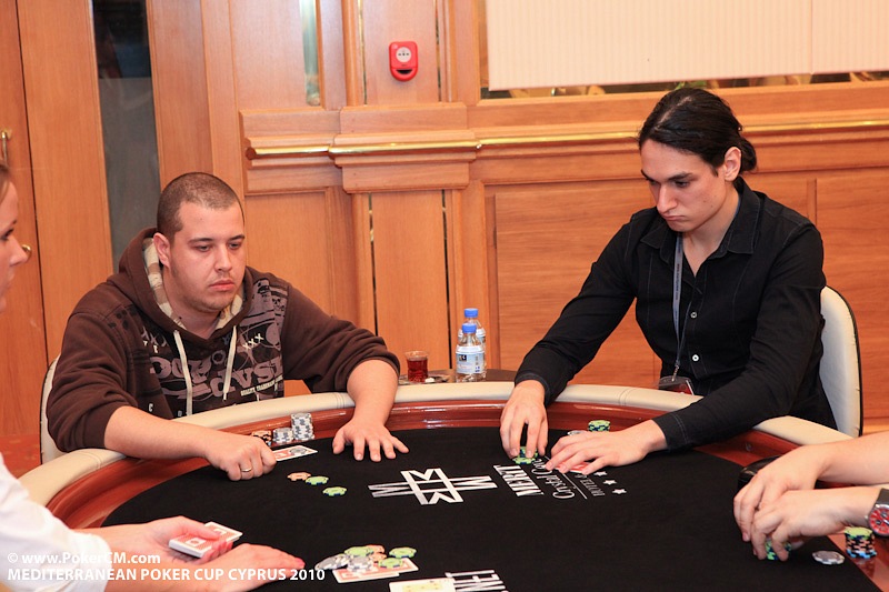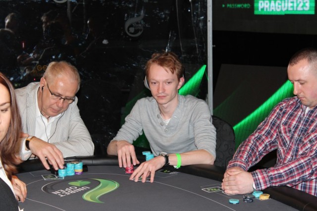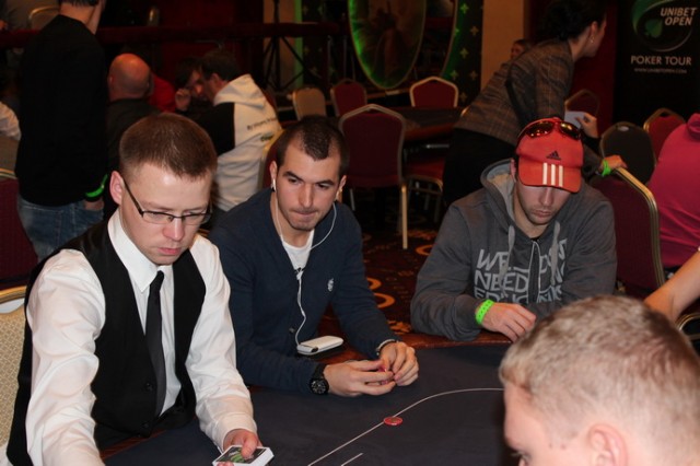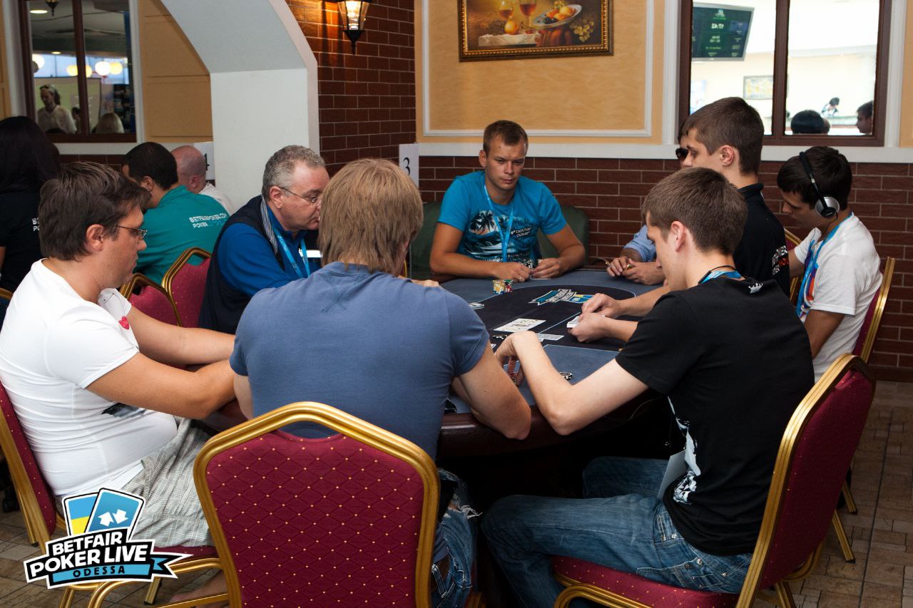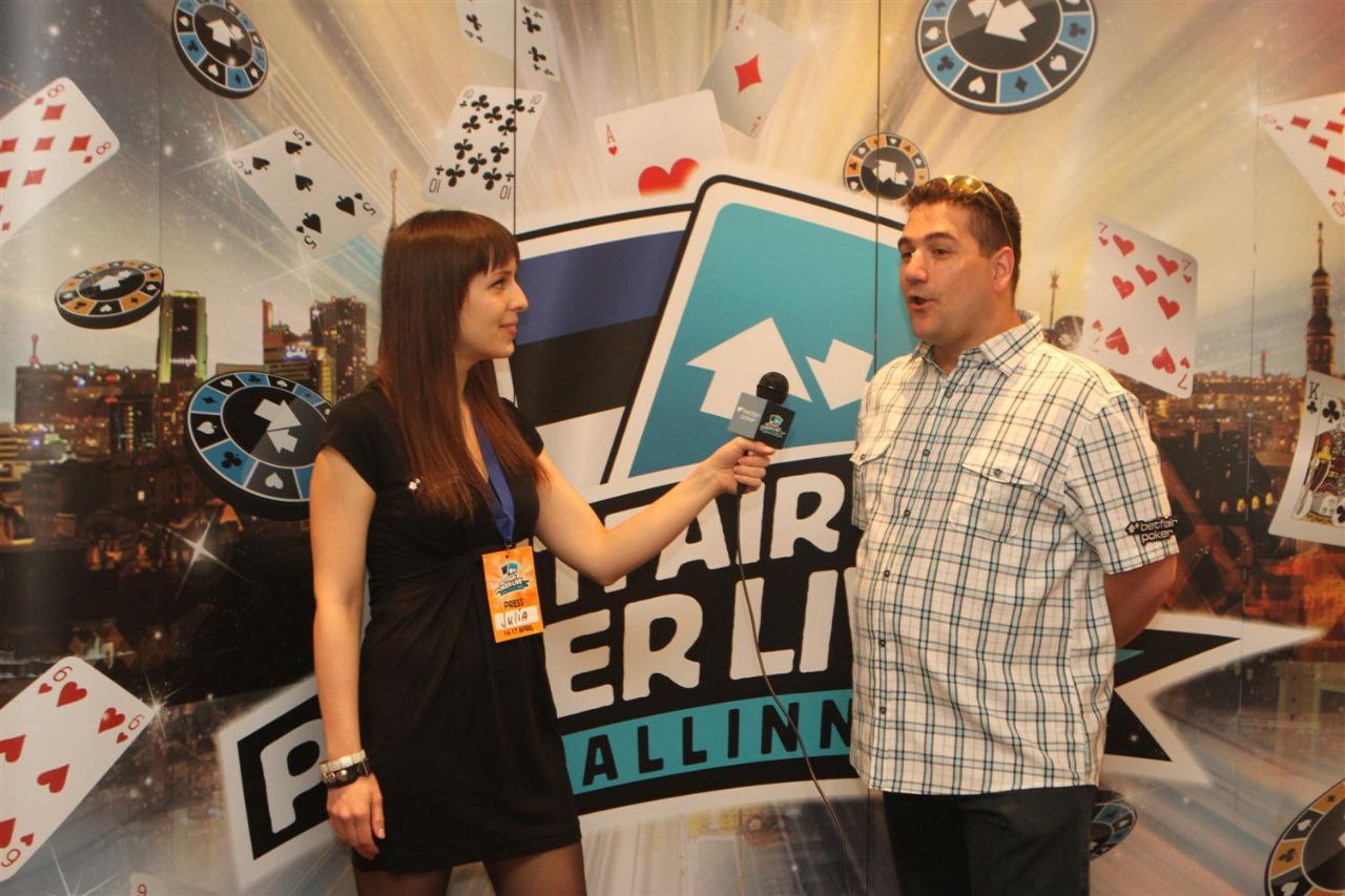 Мой стол, слева на право. Слева от меня сидел очень агрессивный игрок вроде как фин (фин1). Постоянно заходил на эни ту рейзил, ререйзил, в общем играл очень опасно, но вроде как был адекватен. Стек его постоянно колебался от 3 до 12 тысяч. Сразу за ним сидел очень известный в Эстонии агро игрок – Юкка Хелпи, играл не хотя, и по нему было понятно, что на саму игру ему наплевать. Колил любые ставки до ривера и на ривере падал. Какой либо адекватной игры я от него так и не увидел. За ним сидел ещё один фин (фин2). Играл не очень широкий диапазон от 66+ АTs, агрессивно играя при каком либо попадании, иногда блефовал и сильно разыгрывал натсы. Его я для себя пометил как адекватного игрока средней силы. За ним сидел очень слабый, отлично читаемый игрок (фиш). Не знаю от куда он, может тоже фин, может эстонец. Вик тайт, отлично падающий на контбеты, тянущий различные дро и проплачивающий все подряд. Далее сидел пьяный фин, вылетевший 12-й рукой. Он сразу начал играь пуш-фолд, в итоге заколив алын того самого очень слабого парня на А6о против КК. Далее сидел человек, занявший 3-е место в этом турнире. Очень адекватный сильный тайтовый игрок говорящий по-русски (рус1). За ним сидел русский (рус2). Для себя я пометил его как игрока средней силы (скорее даже слабого), падкого на тильт. Он постоянно пытался вскрыть финна (того самого с не очень широким диапазоном). И сразу передо мной сидел абсолютно пьяный американец. Ему адски перло с картой, но об этом потом.