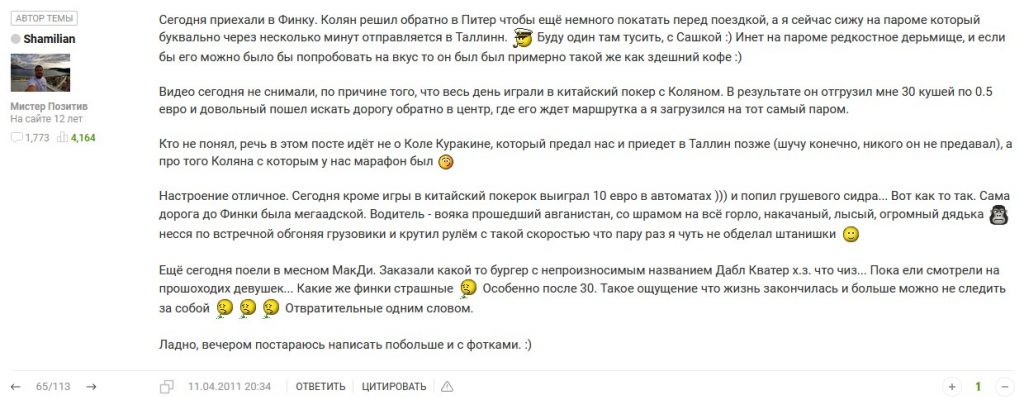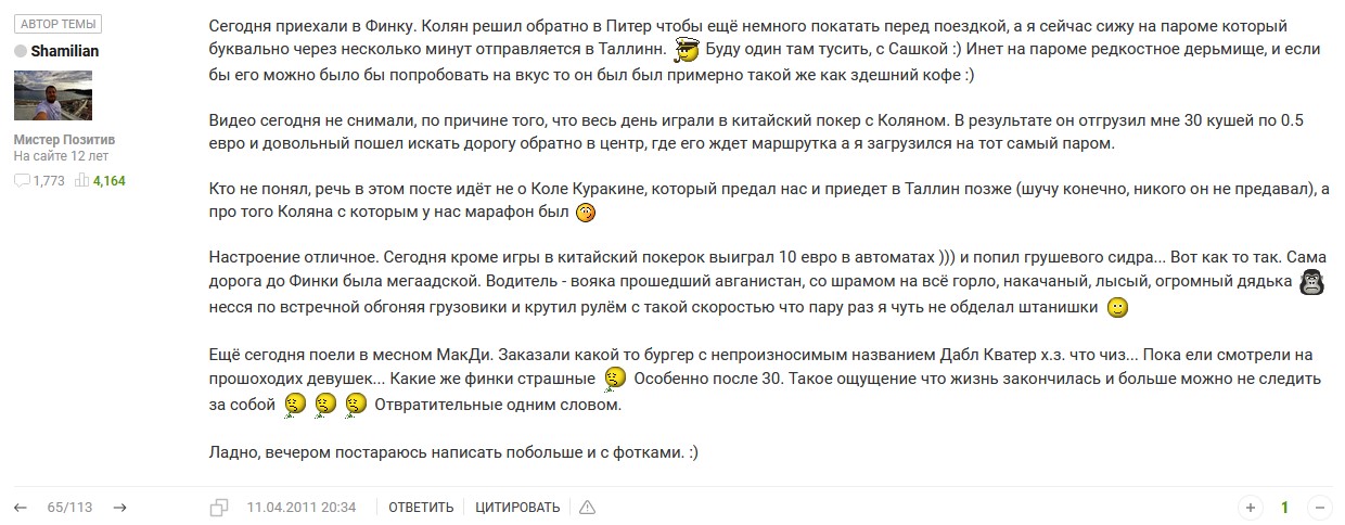 Сегодня, в третий день нашего пребывания я встретился с Максом и он помог мне выложить видео на ютуб, за что ему огромное спасибо. Завтра отчет о 3м и 4м дне, рассказ о панике, которую я поднял и о Эстонском КЭШе. Завтра сателлит с которого будет ещё одно видео, которое я выложу более оперативно.